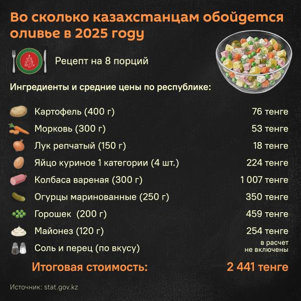 В такую сумму обойдется новогодний стол на семью из восьми человек в разных регионах:• Актау – 120 831 тенге (235,3 доллара)• Астана – 117 307 тенге (228,5 доллара);• Алматы – 112 897 тенге (219,9 доллара);• Усть-Каменогорск – 110 422 тенге (215 долларов);• Семей – 109 361 тенге (212,9 доллара);• Жезказган – 108 856 тенге (212 доллара);• Караганда – 108 769 тенге (211,8 доллара);• Конаев – 108 465 тенге (211,2 доллара);• Талдыкорган – 108 177 тенге (210,7 доллара);• Шымкент – 108 141 тенге (210,6 доллара);• Павлодар – 107 964 тенге (210,3 доллара);• Кокшетау – 107 109 тенге (208,6 доллара);• Тараз – 105 935 тенге (206,2 доллара);• Атырау – 105 654 тенге (205,8 доллара);• Кызылорда – 105 141 тенге (204,8 доллара);• Петропавловск – 105 081 тенге (204,7 доллара);• Костанай – 104 972 тенге (204,5 доллара);• Туркестан – 104 793 тенге (204 доллара);• Уральск – 104 647 тенге (203,8 доллара);• Актобе – 102 541 тенге (199,7 доллара).